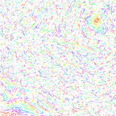 Mostly an excuse to implement Robert Bridson's excellent Fast Poisson Disk Sampling algorithm, the colourful lines are only drawn if the points are neighbours spatially and temporally, highlighting how the algorithm sweeps across the plane.